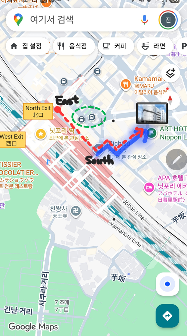 구글맵에서 우리가 머물렀던 호텔의 위치를 찾아보면 위 지도와 같습니다. 닛포리 역의 출구는 위 그림처럼 동서남북으로 있는데, South Exit로 나오면 호텔 뒷문과 거리가 걸어서 3분 정도입니다(파란색 실선경로). 그리고 캐리어나 짐이 있을때에는 조금 더 걸어도 East Exit로 나와야 에스컬레이터를 탈수 있습니다(빨간색 점선경로). 저도 처음 닛포리역에 내렸을 때 South Exit로 나오는 바람에 캐리어를 들고 계단을 내려와야 했습니다. 꼭 참고하세요~